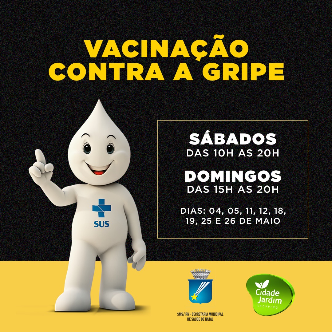 Durante todos os fins de semana do mês de maio, a começar deste (04 e 05), a Secretaria Municipal de Saúde estará no Shopping Cidade Jardim com a campanha de vacinação contra a Influenza.