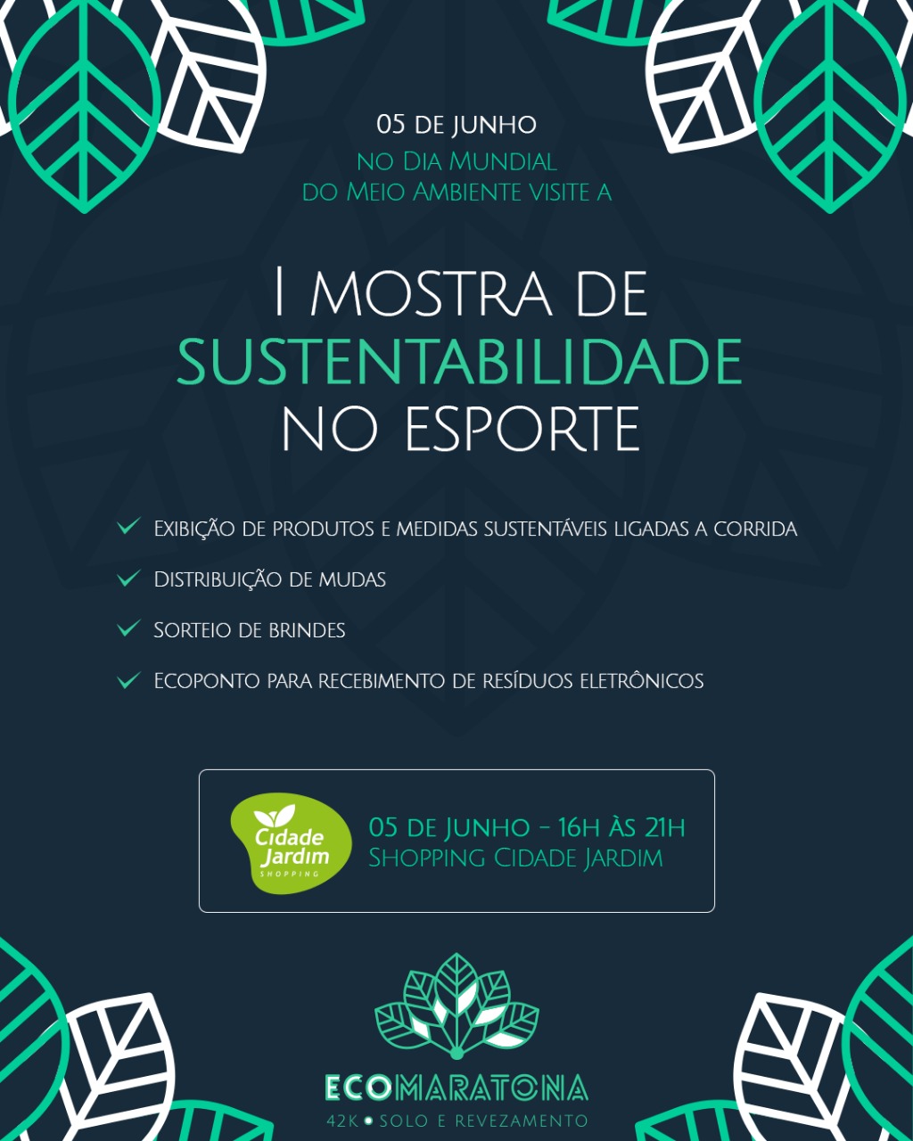 O Dia Mundial do Meio Ambiente se aproxima e, em celebração a isso, o Shopping Cidade Jardim e a Ecomaratona 42K firmaram uma parceria em prol da conscientização por ações ecologicamente corretas. A 1ª Mostra de Sustentabilidade no Esporte acontecerá no hall de eventos do mall, dia 05 de junho, das 16h às 21h, com acesso totalmente gratuito.