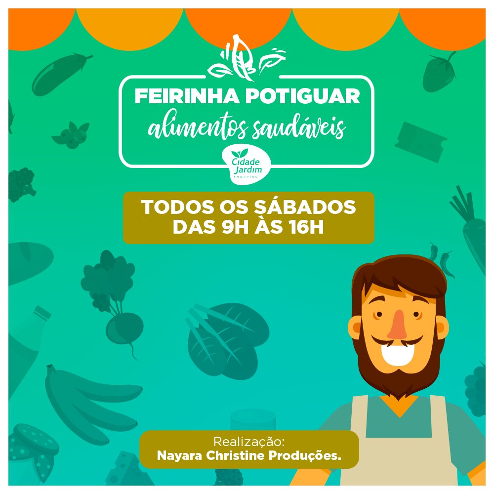 Sempre em busca de oferecer praticidade aos consumidores, o Shopping Cidade Jardim se adapta a demanda do público. A já consolidada Feirinha Potiguar Alimentos Saudáveis está se ampliando e passa a ofertar ainda mais variação de produtos saudáveis que agradem a população fitness. A feira acontece semanalmente, aos sábados, agora das 9h às 16h, oferecendo aos clientes ainda mais tempo para aproveitar os produtos regionais e saudáveis disponíveis na feira.