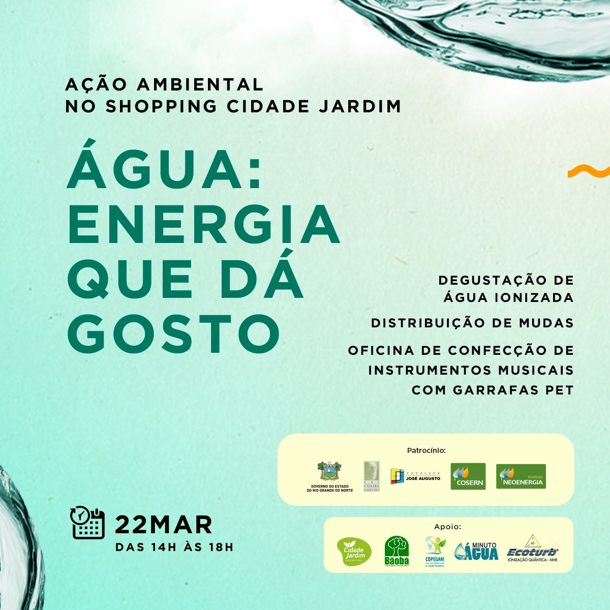 O evento "Água: Energia que dá gosto" tem patrocínio da COSERN, do Grupo Neoenergia, e do Governo do RN, através da Lei Estadual Câmara Cascudo, além de apoio da empresa Minuto Água, Ong Baobá, SEBRAE-RN, Arribaçã Produções e COPEGAM – Comissão Permanente de Gestão Ambiental do Tribunal de Justiça.