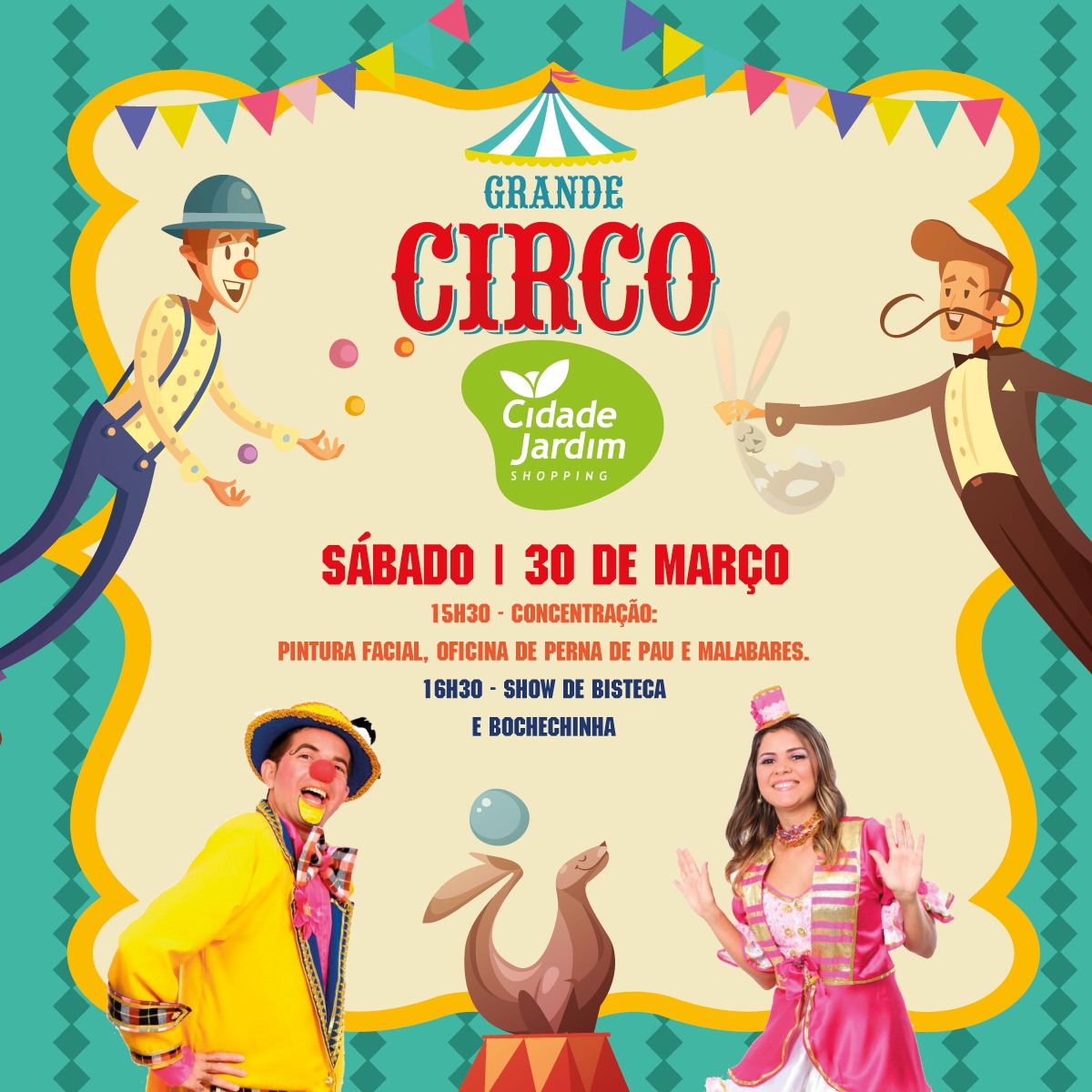 Em comemoração ao dia do circo, teremos uma super programação para a criançada com personagens circenses, pintura facial, oficinas e show dos nossos palhaços preferidos, Bisteca e Bochechinha.
