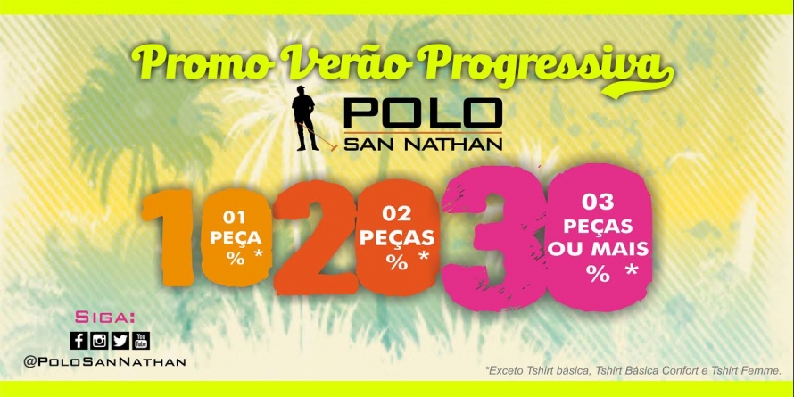 Na Polo San Nathan você renova o seu guarda-roupa e ainda garante desconto progressivo de até 30%! Venha aproveitar e ficar na moda para o Verão 2016!