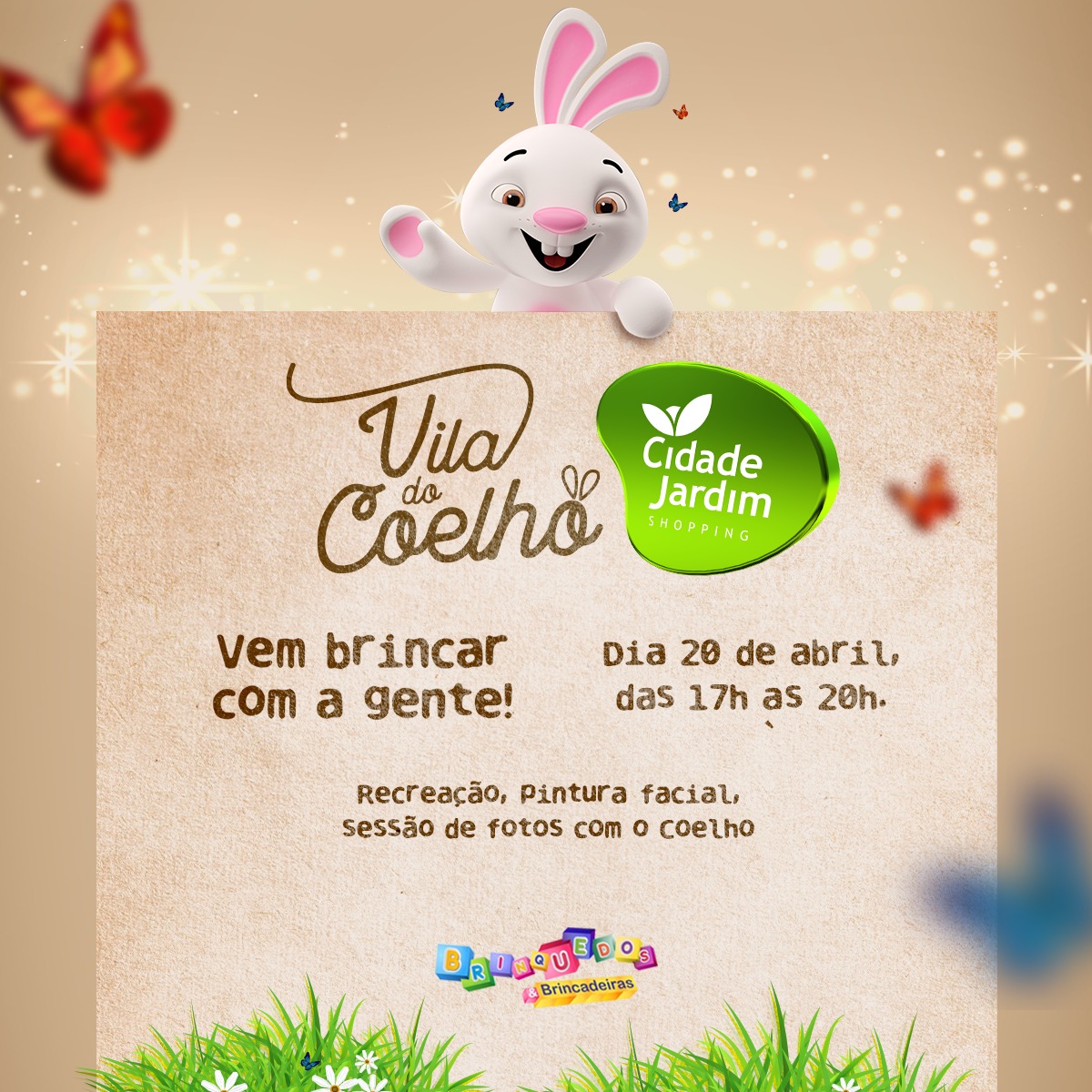No sábado, 20 de abril a partir das 17h teremos muita recreação, pintura facial, sessão de fotos com o Coelho e muita diversão para a criançada com a Brinquedos e Brincadeiras!